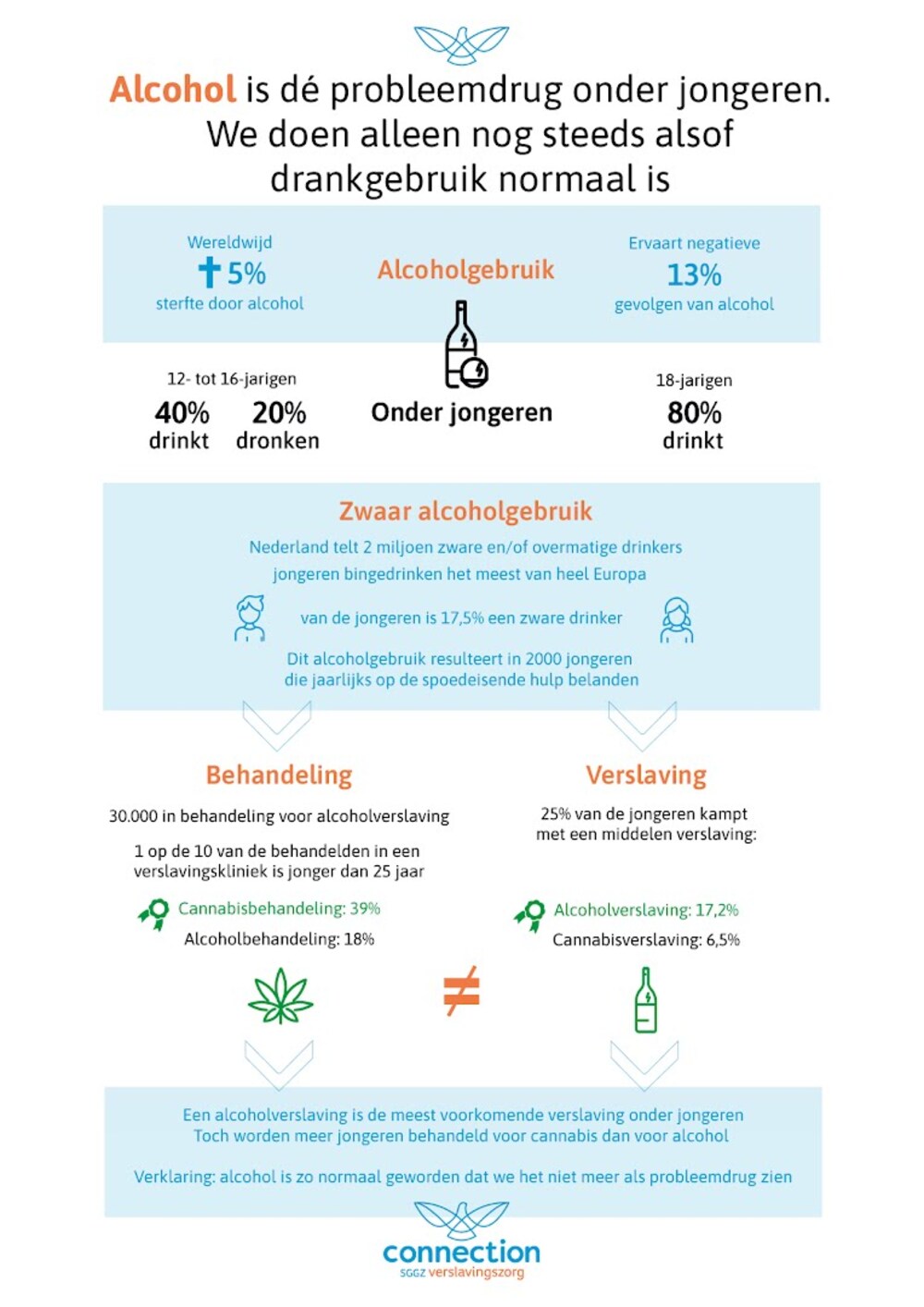 Niet cannabis, maar alcohol is nog steeds de meest populaire drug onder jongeren. Jongeren drinken te veel en te vroeg, met alle ernstige gevolgen van dien. Dat blijkt uit een onderzoek van Connection SGGZ.