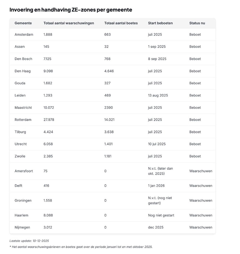 Nederlandse gemeenten hebben de handhaving verscherpt op bestel- en vrachtvoertuigen die zonder de vereiste toestemming een zero-emissiezone (ZE-zone) inrijden. Uit een analyse van gemeentelijke rapportages door vergelijkingswebsite Overstappen.nl blijkt dat er in 2025 in totaal 29.536 boetes zijn opgelegd aan overtreders. Dit volgde op een maandenlange waarschuwingsperiode waarin meer dan 85.000 waarschuwingsbrieven werden verstuurd.
