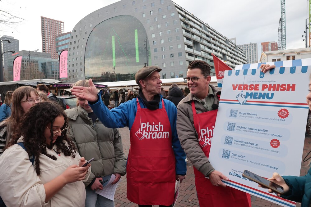Phishkraam, bugün Rotterdam’daki Binnenrotte pazarında gerçek bir balık tezgâhı ile ziyaretçilerin karşısına çıktı. Etkinlik, “Laat je niet interneppen” (İnternette kandırılma) adlı bilinçlendirme kampanyasının bir parçası olarak düzenlendi.