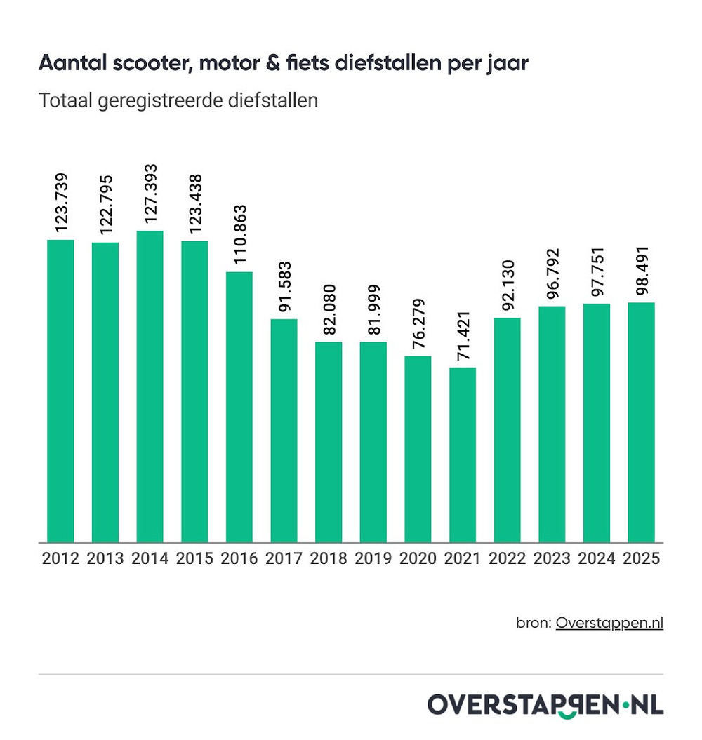 Het aantal gestolen scooters, motoren en fietsen is in 2025 fors toegenomen, na een jarenlange daling. In 2021 lag het aantal gestolen scooters het laagst sinds 2012 met 71.421 scooterdiefstallen in totaal. In 2025 is dat aantal opgelopen tot 98.491, een stijging van bijna 38% ten opzichte van 2021. Dat blijkt uit een analyse van politiedata door vergelijkingswebsite Overstappen.nl. Deze diefstaltoename kan eigenaren hoge kosten en logistieke problemen bezorgen.